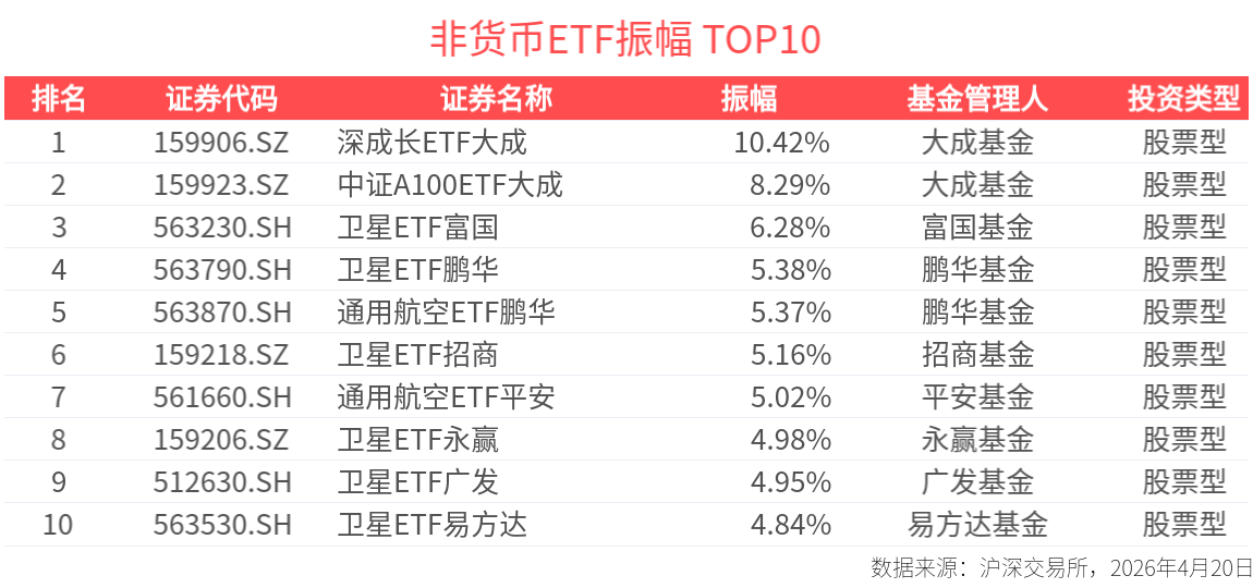 截至今日收盘,深成长ETF大成、中证A100ETF大成、卫星ETF富国振幅居市场前列,分别达10.42%、8.29%、6.28%。