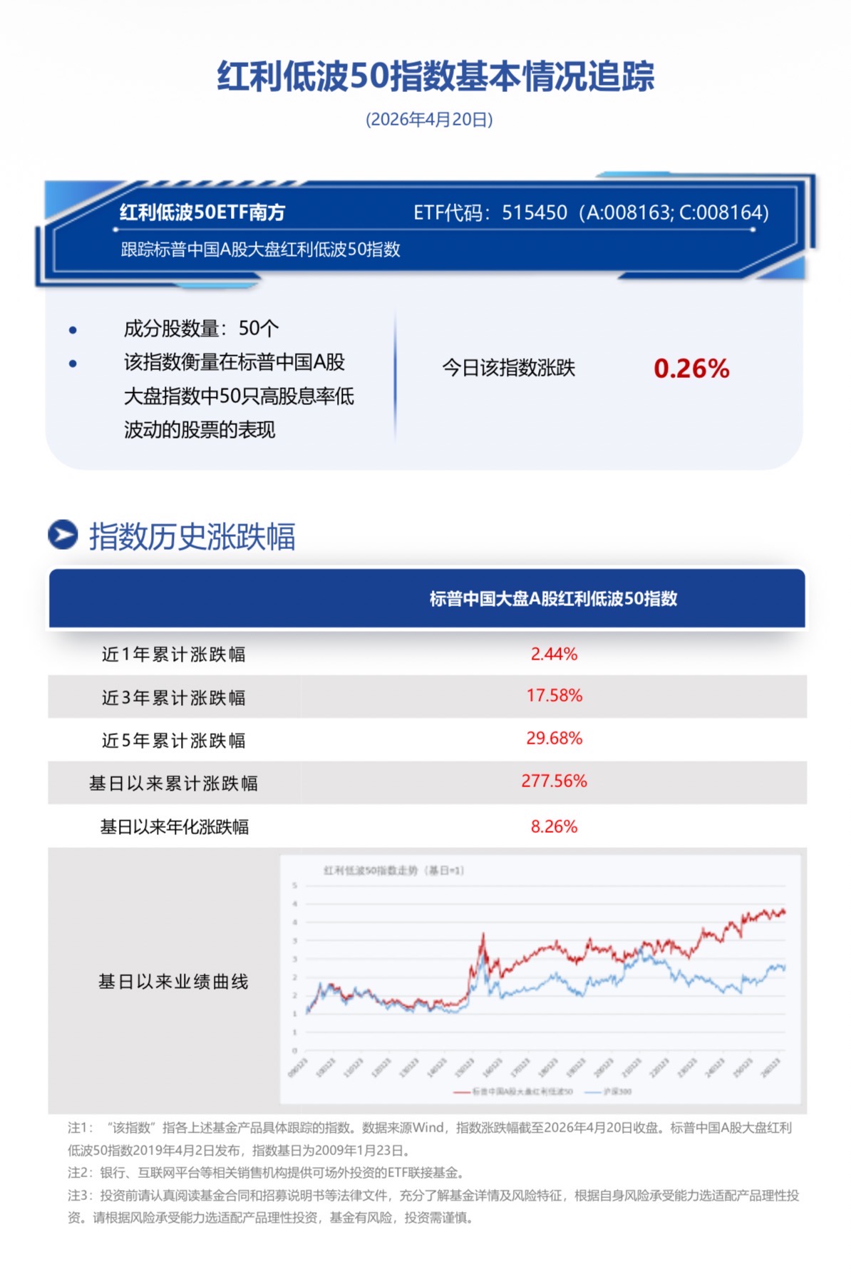 截至2026年4月20日收盘,红利低波50ETF南方(515450)换手0.68%,成交1.15亿元,跟踪标的指数标普中国A股大盘红利低波50指数(SPCLLHCP.SPI)涨0.26%。