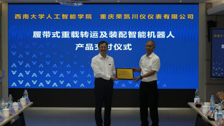 现场还举行了“履带式重载转运及装配智能机器人”产品交付仪式,重庆荣凯川仪仪表有限公司董事长王德伟与人工智能学院院长段书凯共同完成交付,标志着学院科研成果成功实现产业化应用,校企协同创新迈出关键一步。