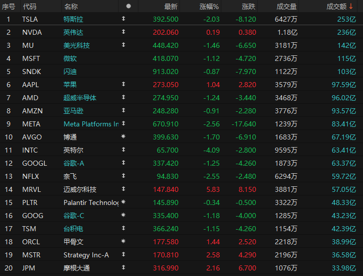第3名美光收跌1.46%,成交142亿美元。美光官网显示,其已正式提供24Gb (3GB) 容量版本的GDDR7显存(内存),提供32Gbps和28Gbps两种规格。