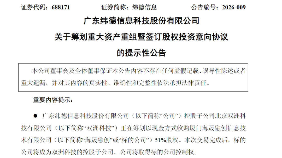 4月20日,纬德信息(688171)发布公告称,公司控股子公司双洲科技正筹划以现金方式收购海晟融创51%股权。本次交易完成后,海晟融创将成为双洲科技的控股子公司,公司将取得海晟融创控制权。本次交易预计构成重大资产重组,公司股票将不停牌。