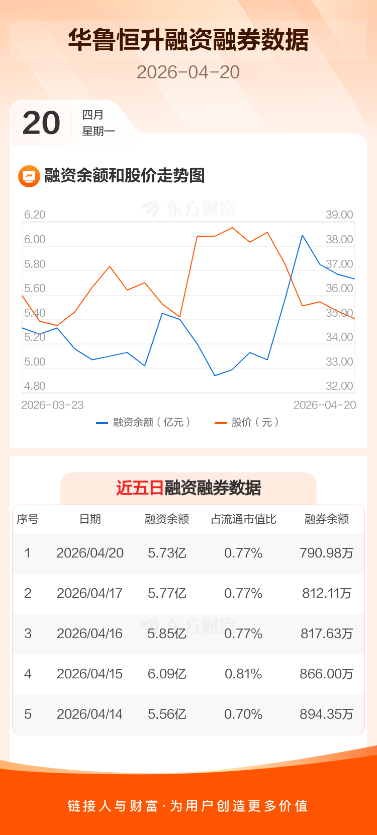 交易所最新数据显示,华鲁恒升于2026年4月20日获融资买入3204.94万元,融资偿还3534.59万元,当日融资净偿还329.65万元。目前,该股融资余额5.73亿,占流通市值比例为0.77%。