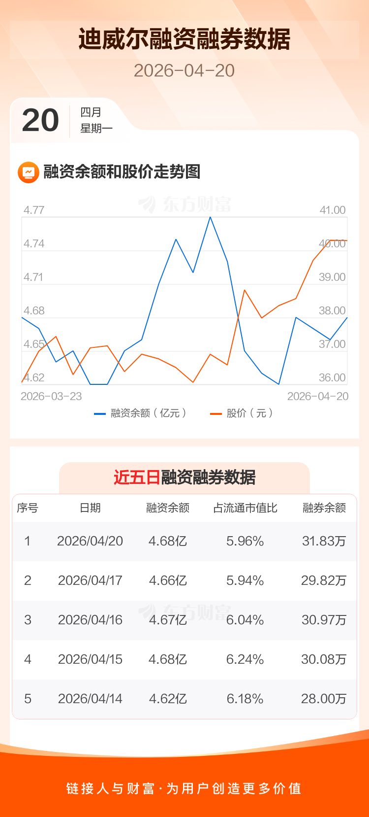 交易所最新数据显示,迪威尔于2026年4月20日获融资买入729.16万元,融资偿还566.58万元,当日融资净买入162.57万元。目前,该股融资余额4.68亿,占流通市值比例为5.96%。
