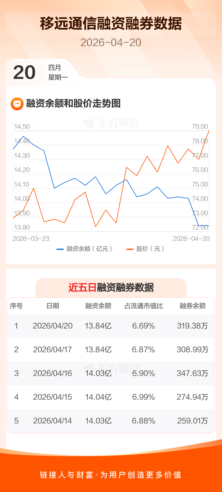 交易所最新数据显示,移远通信于2026年4月20日获融资买入7334.63万元,融资偿还7368.91万元,当日融资净偿还34.27万元。目前,该股融资余额13.84亿,占流通市值比例为6.69%。