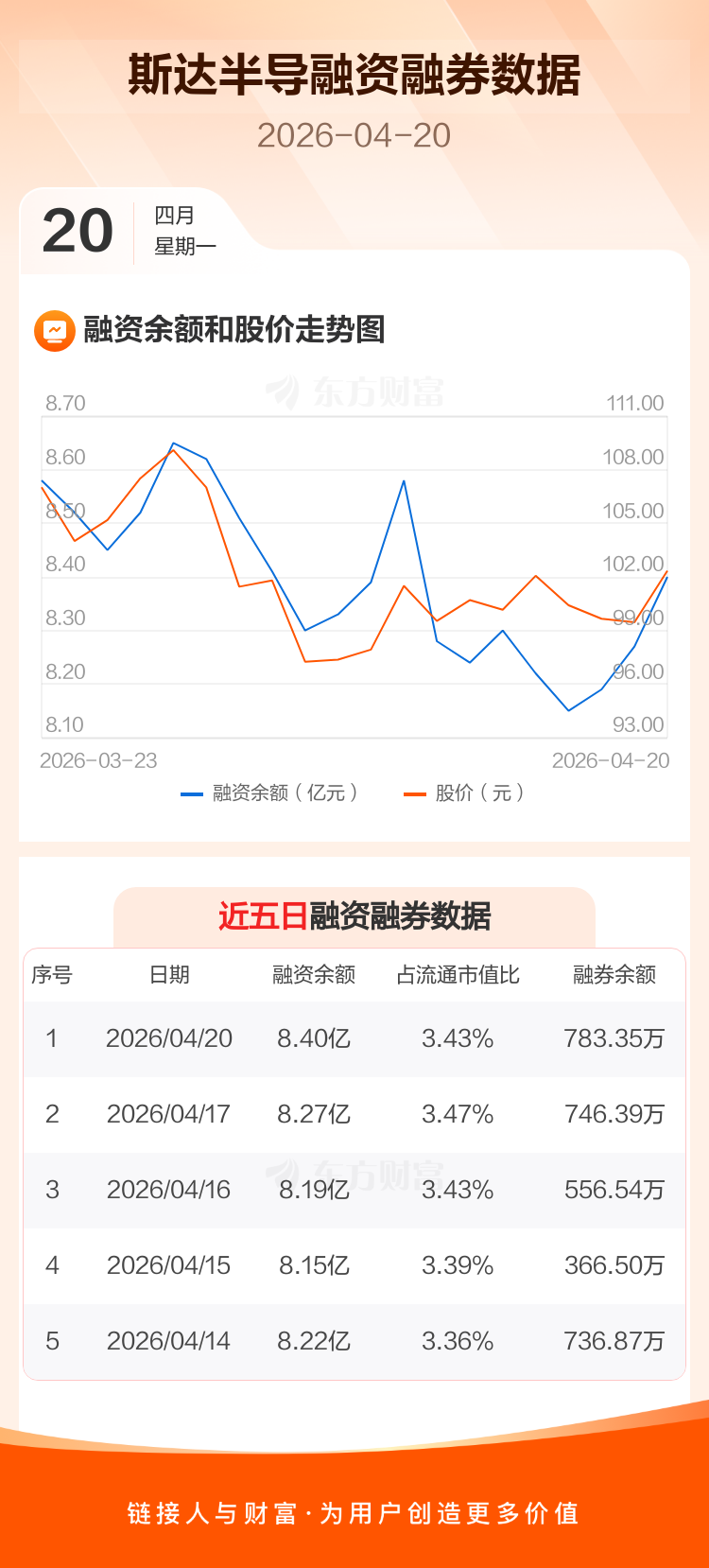 交易所最新数据显示,斯达半导于2026年4月20日获融资买入5809.06万元,融资偿还4456.80万元,当日融资净买入1352.26万元。目前,该股融资余额8.40亿,占流通市值比例为3.43%。