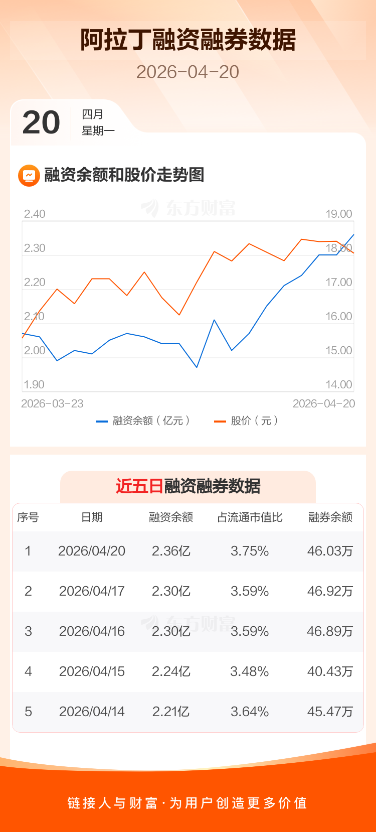 交易所最新数据显示,阿拉丁于2026年4月20日获融资买入2220.46万元,融资偿还1669.93万元,当日融资净买入550.53万元。目前,该股融资余额2.36亿,占流通市值比例为3.75%。