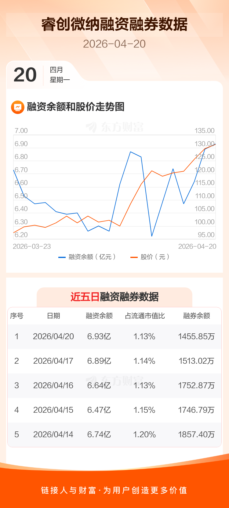 交易所最新数据显示,睿创微纳于2026年4月20日获融资买入8883.12万元,融资偿还8446.69万元,当日融资净买入436.43万元。目前,该股融资余额6.93亿,占流通市值比例为1.13%。