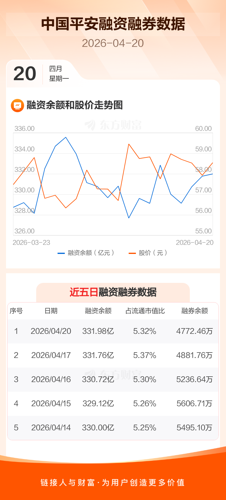 交易所最新数据显示,中国平安于2026年4月20日获融资买入3.15亿元,融资偿还2.93亿元,当日融资净买入2244.53万元。目前,该股融资余额331.98亿,占流通市值比例为5.32%。