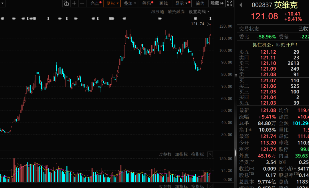 值得关注的是,近10个交易日以来,英维克股价持续大涨,累计涨幅接近45%。公司最新股价为121.08元/股,总市值1183.49亿元。