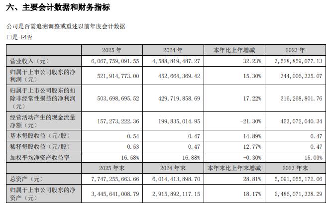 2025年,英维克实现营收60.68亿元,同比增长32.23%;归属于上市公司股东的净利润5.22亿元,同比增长15.30%;归属于上市公司股东的扣除非经常性损益的净利润5.04亿元,同比增长17.22%。公司拟每10股派发现金红利1.7元(含税),每10股转增3股。
