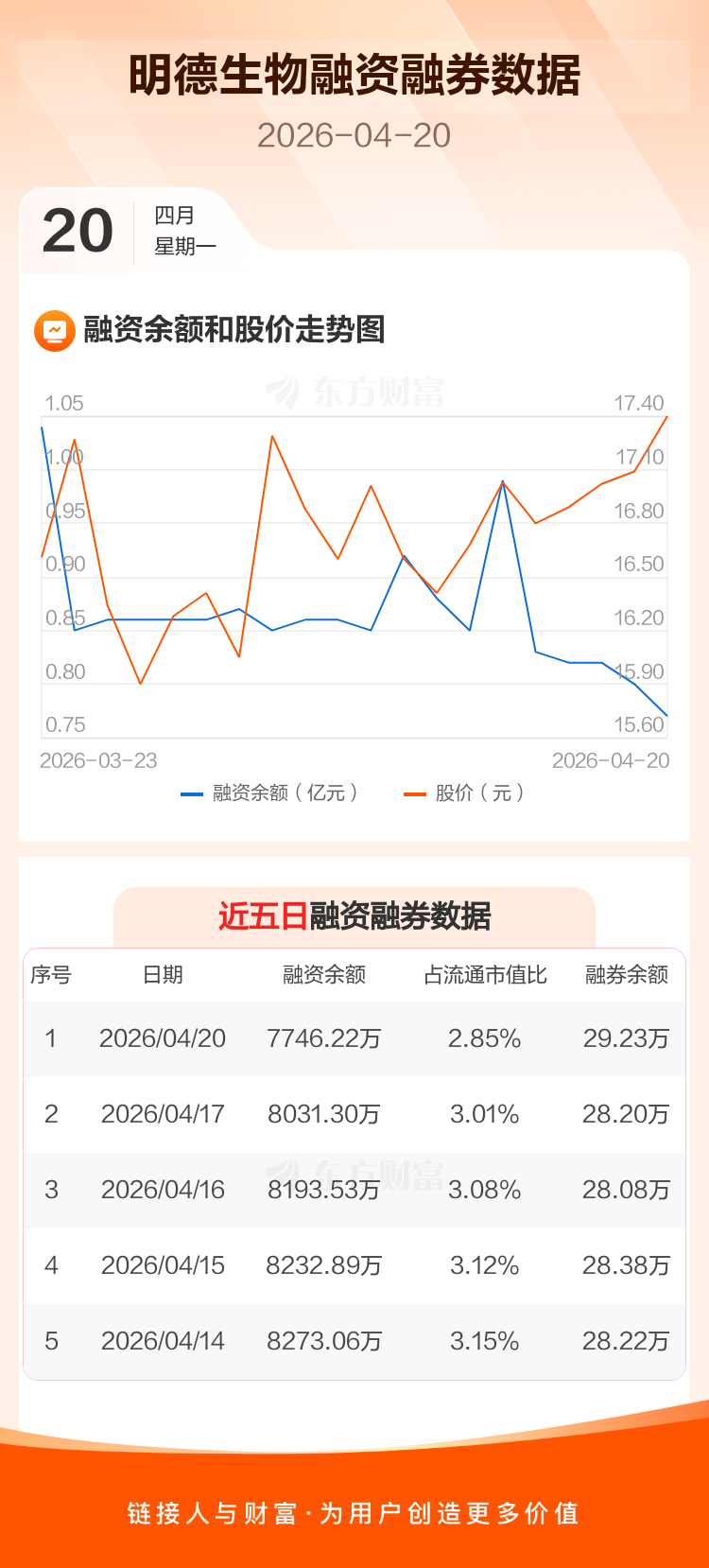 交易所最新数据显示,明德生物于2026年4月20日获融资买入798.95万元,融资偿还1084.04万元,当日融资净偿还285.08万元。目前,该股融资余额7746.22万,占流通市值比例为2.85%。