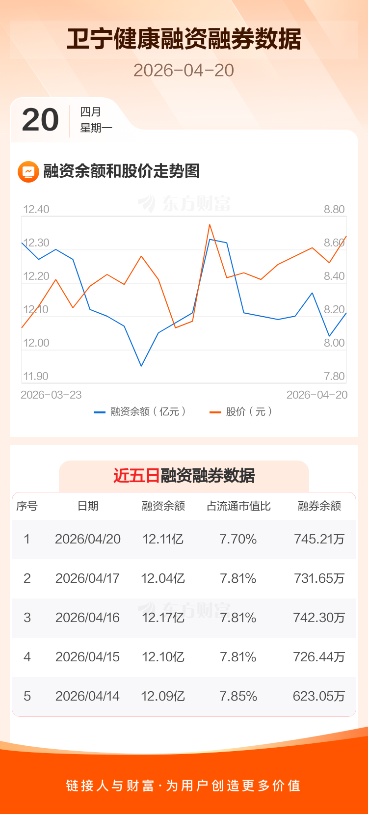 交易所最新数据显示,卫宁健康于2026年4月20日获融资买入5160.34万元,融资偿还4516.23万元,当日融资净买入644.11万元。目前,该股融资余额12.11亿,占流通市值比例为7.70%。