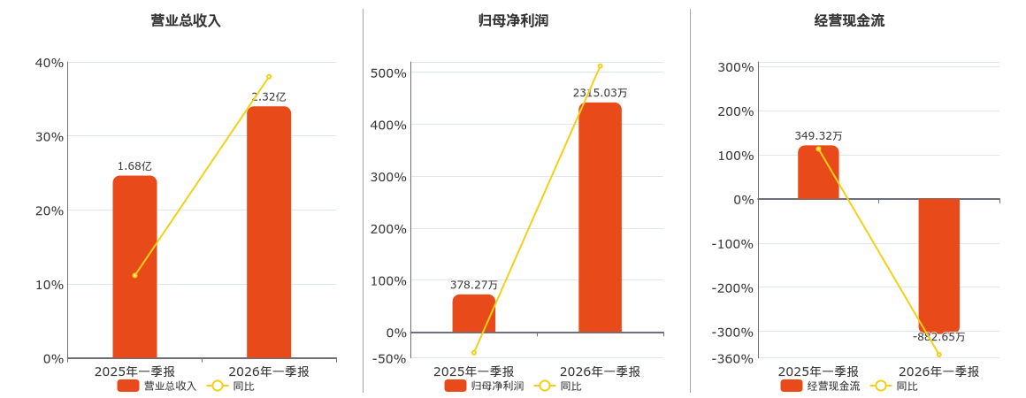 公司营业总收入为2.32亿元,较去年同报告期营业总收入增加6376.11万元,实现2年连续上涨,同比较去年同期上涨38.00%。归母净利润为2315.03万元,较去年同报告期归母净利润增加1936.76万元,同比较去年同期上涨512.01%。经营活动现金净流入为-882.65万元。