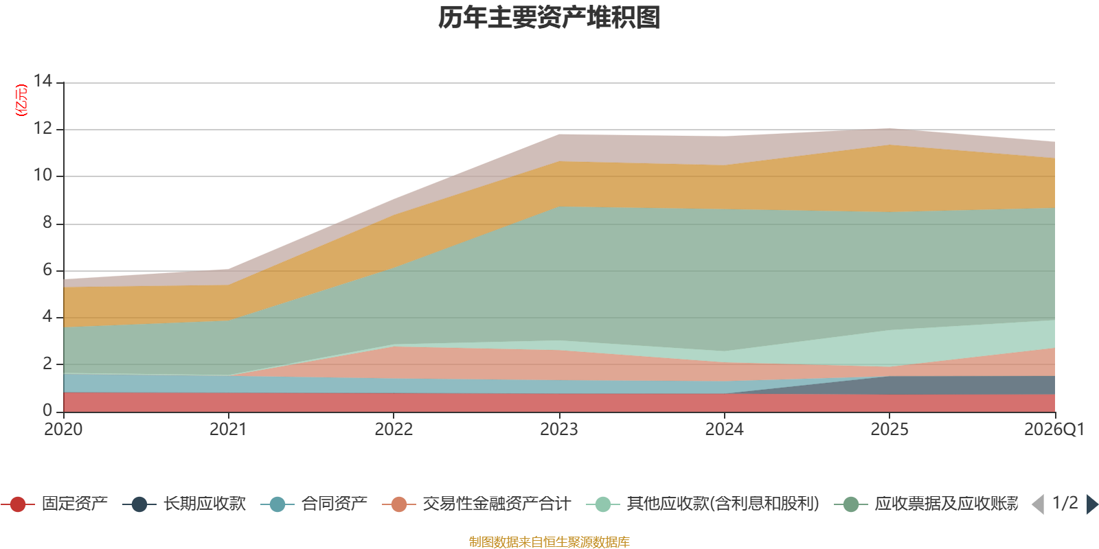 资产重大变化方面,截至2026年一季度末,公司交易性金融资产合计较上年末增加199.75%,占公司总资产比重上升7.14个百分点;货币资金较上年末减少25.94%,占公司总资产比重下降5.27个百分点;其他应收款(含利息和股利)较上年末减少24.24%,占公司总资产比重下降2.65个百分点;长期应收款较上年末增加0.3%,占公司总资产比重上升0.34个百分点。