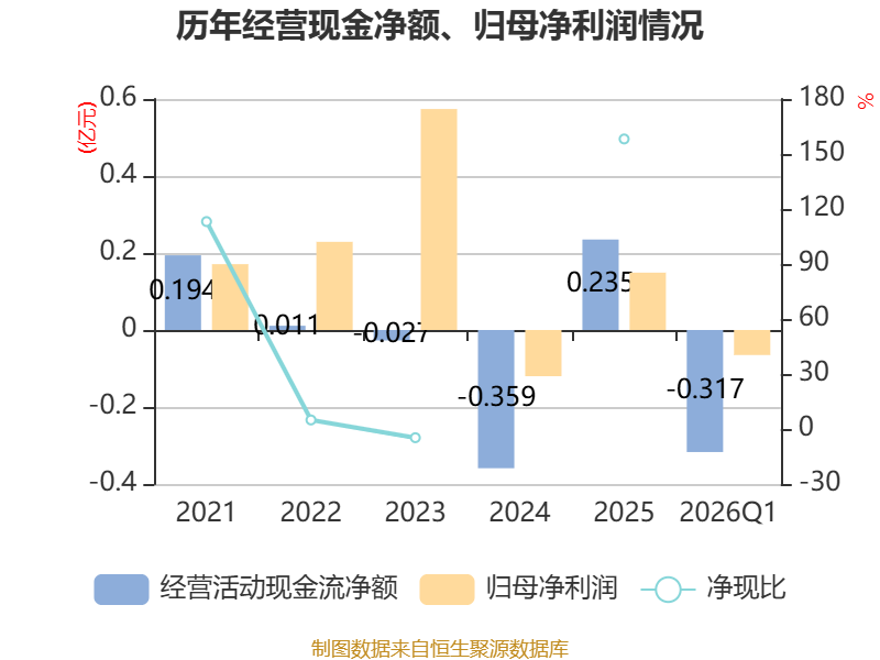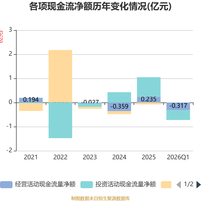 截至2026年一季度末,公司经营活动现金流净额为-3165.37万元,同比减少6718.66万元;筹资活动现金流净额-47.38万元,同比增加3402.31万元;投资活动现金流净额-4070.22万元,上年同期为2988.08万元。