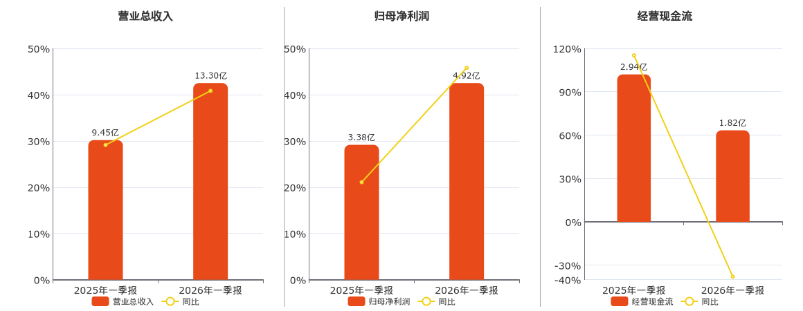 公司营业总收入为13.30亿元,较去年同报告期营业总收入增加3.86亿元,实现5年连续上涨,同比较去年同期上涨40.82%。归母净利润为4.92亿元,较去年同报告期归母净利润增加1.55亿元,实现5年连续上涨,同比较去年同期上涨45.79%。经营活动现金净流入为1.82亿元。