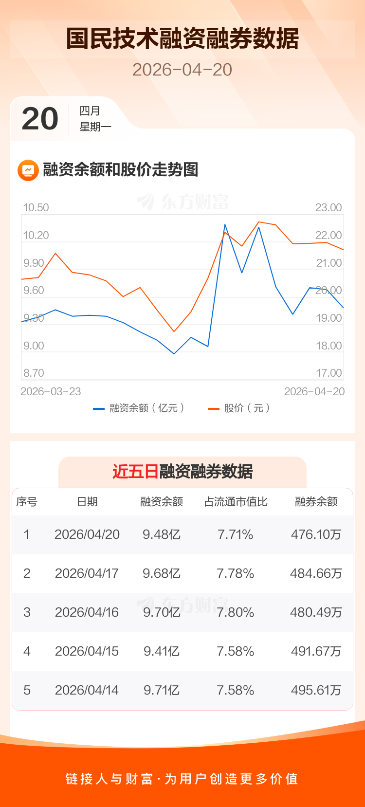 交易所最新数据显示,国民技术于2026年4月20日获融资买入4620.49万元,融资偿还6675.03万元,当日融资净偿还2054.54万元。目前,该股融资余额9.48亿,占流通市值比例为7.71%。