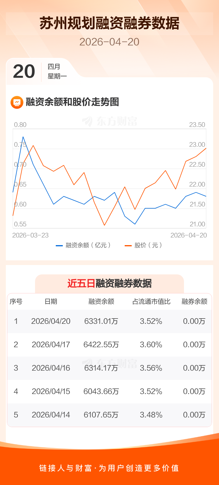 交易所最新数据显示,苏州规划于2026年4月20日获融资买入476.41万元,融资偿还567.95万元,当日融资净偿还91.54万元。目前,该股融资余额6331.01万,占流通市值比例为3.52%。