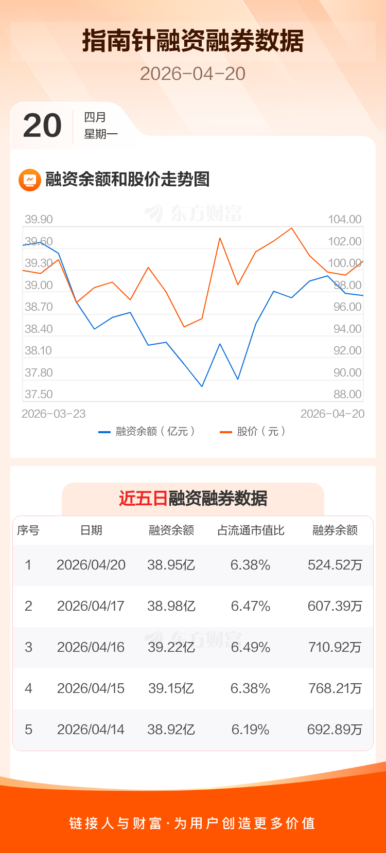 交易所最新数据显示,指南针于2026年4月20日获融资买入1.92亿元,融资偿还1.95亿元,当日融资净偿还282.82万元。目前,该股融资余额38.95亿,占流通市值比例为6.38%。