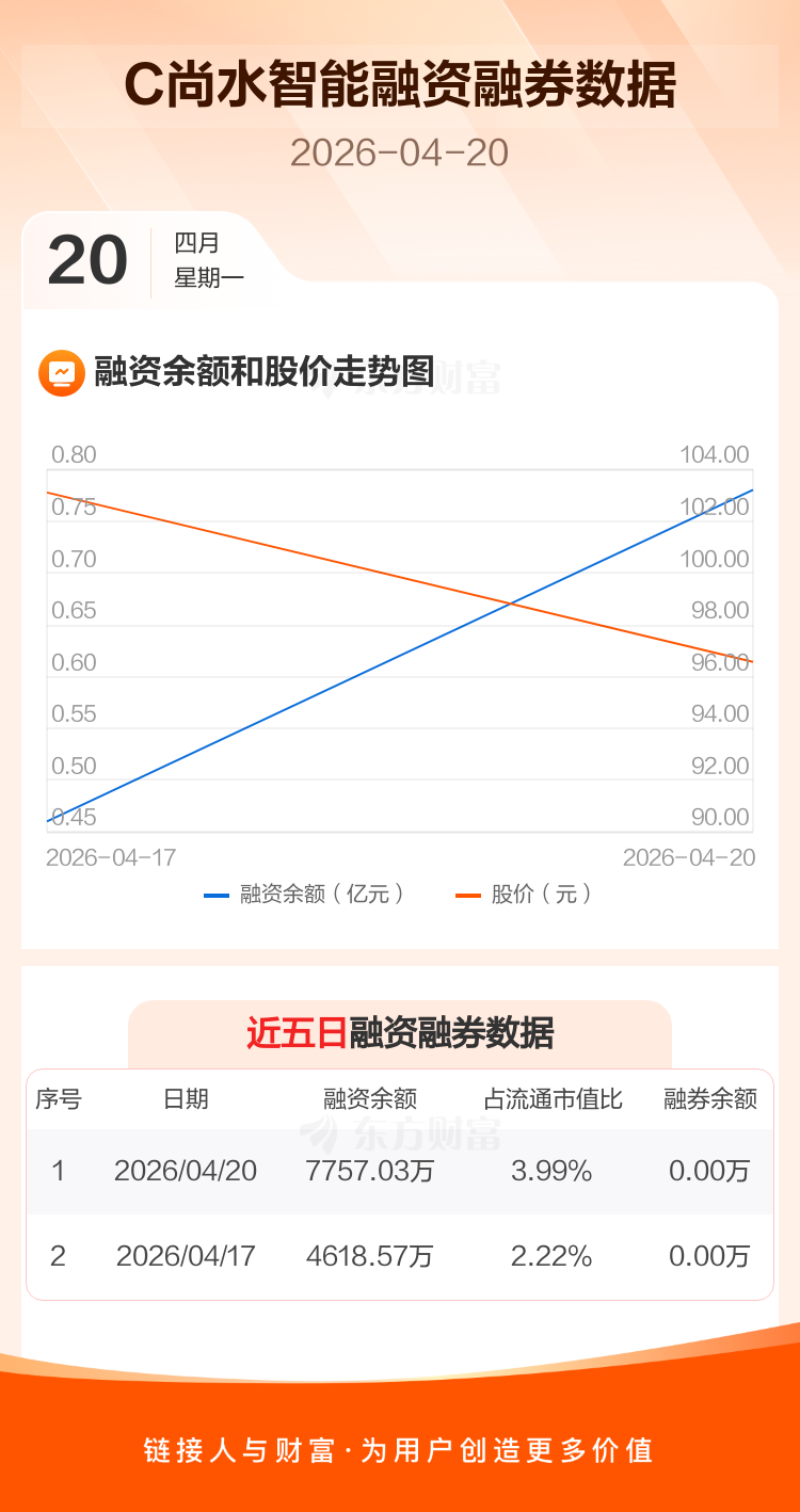 交易所最新数据显示,C尚水智能于2026年4月20日获融资买入6397.18万元,融资偿还3258.71万元,当日融资净买入3138.47万元。目前,该股融资余额7757.04万,占流通市值比例为3.99%。
