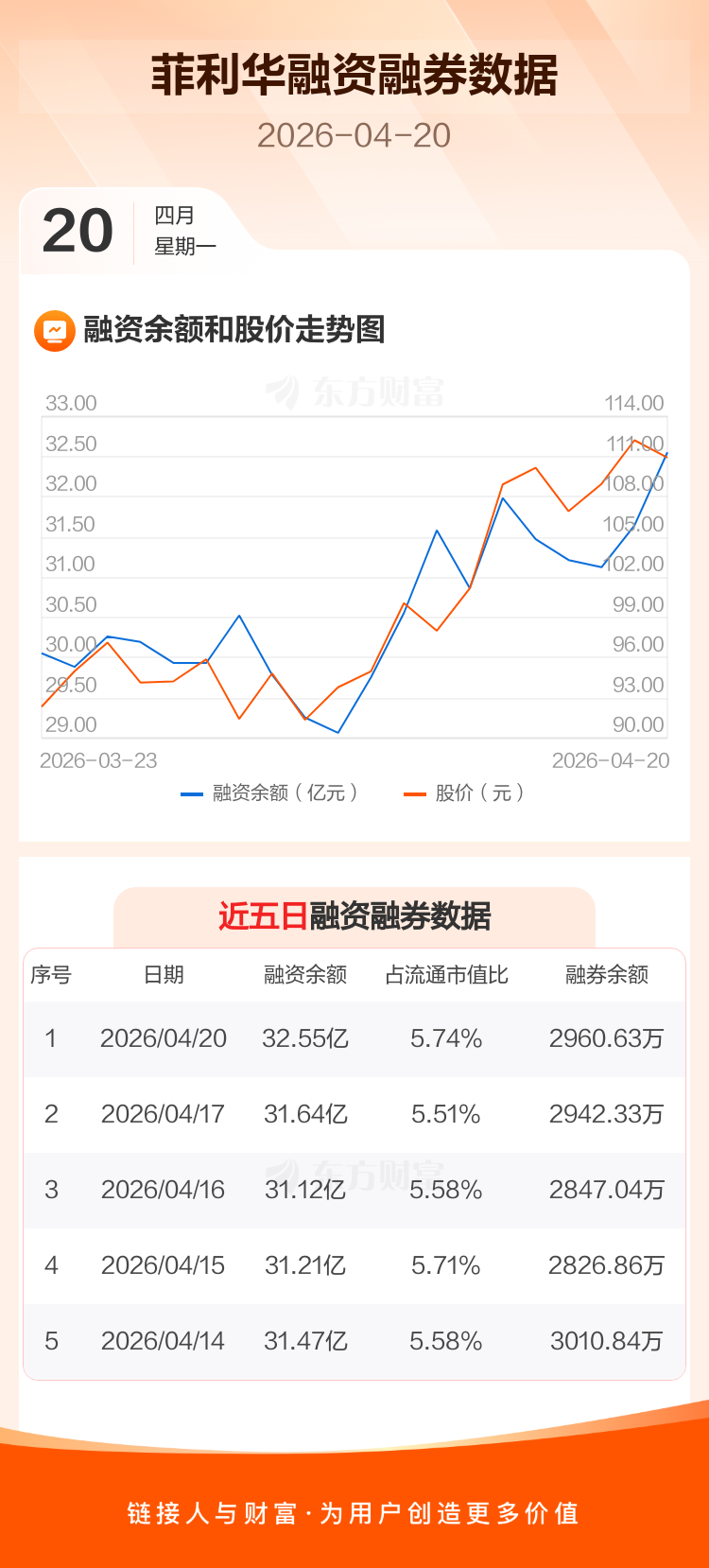 交易所最新数据显示,菲利华于2026年4月20日获融资买入6.09亿元,融资偿还5.18亿元,当日融资净买入9086.35万元。目前,该股融资余额32.55亿,占流通市值比例为5.74%。