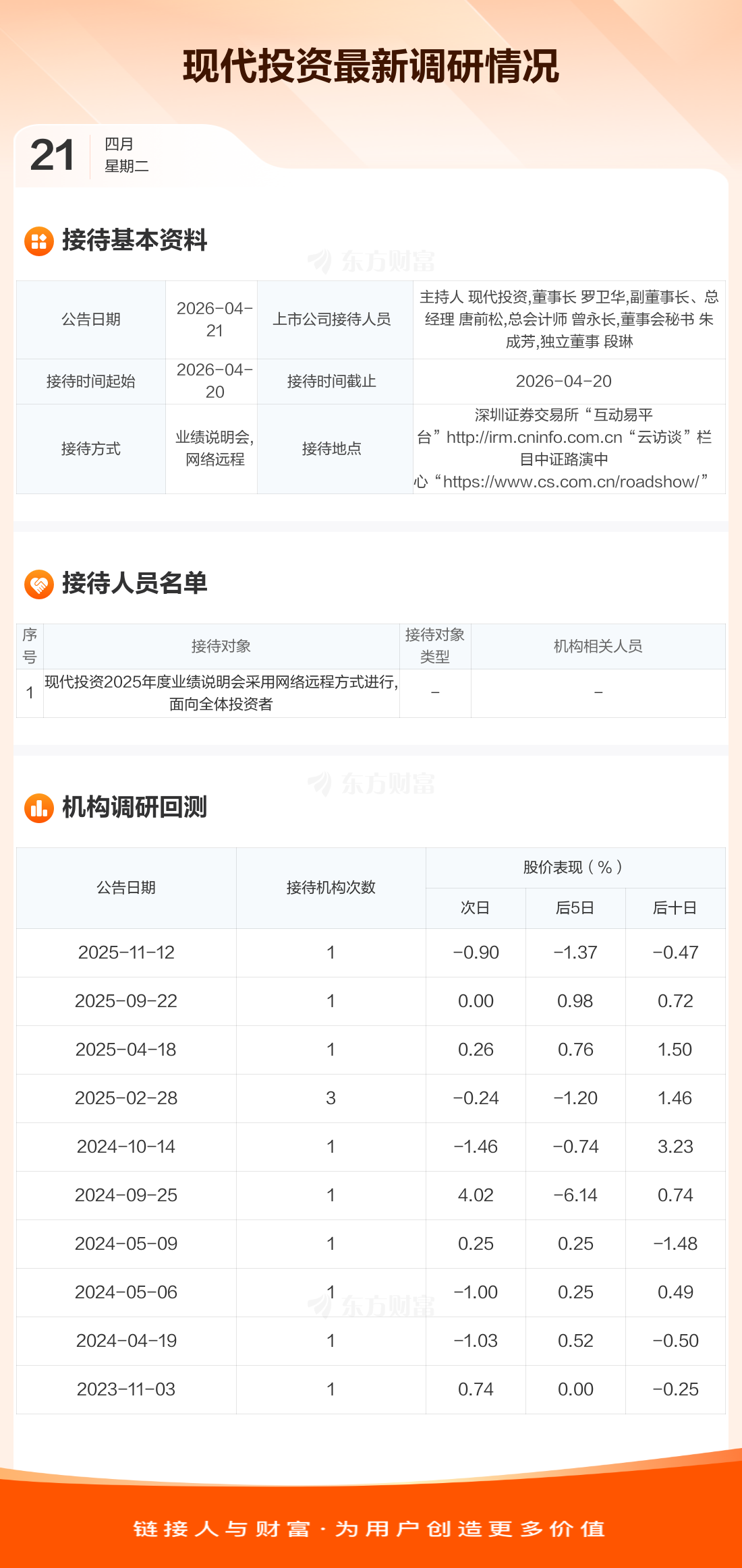 【调研快报】现代投资接待现代投资2025年度业绩说明会采用网络远程方式进行,面向全体投资者调研