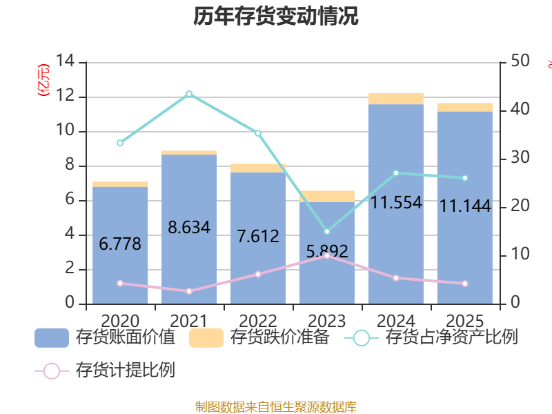 从存货变动来看,截至2025年末,公司存货账面价值为11.14亿元,占净资产的26%,较上年末减少4100.69万元。其中,存货跌价准备为4827.45万元,计提比例为4.15%。