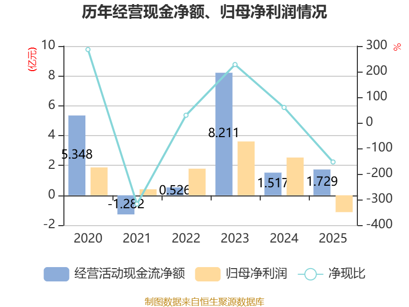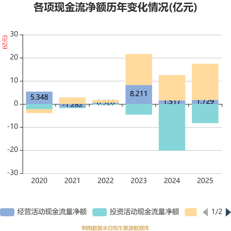 截至2025年,公司经营活动现金流净额为1.73亿元,同比增长13.95%;筹资活动现金流净额15.69亿元,同比增加4.72亿元;投资活动现金流净额-8.3亿元,上年同期为-20.18亿元。