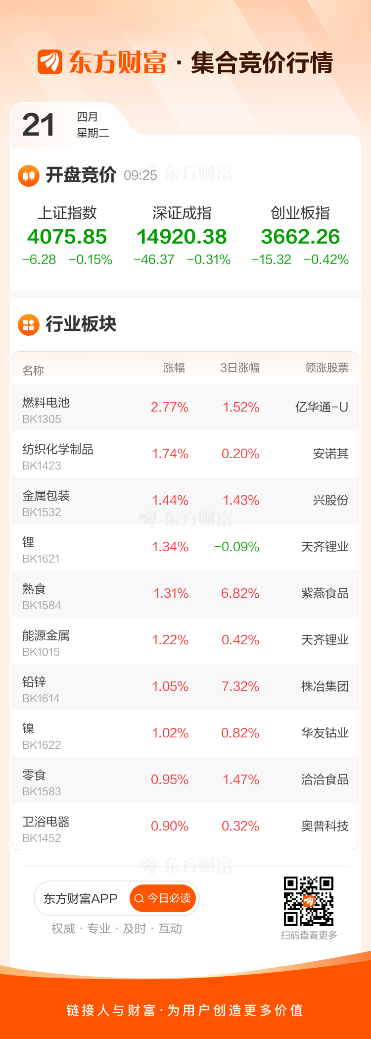 4月21日,三大指数集体低开,上证指数低开0.15%,深证成指低开0.31%,创业板指低开0.42%。板块方面,燃料电池领涨,亿华通-U涨2.77%,纺织化学制品、金属包装等开盘涨幅居前。
