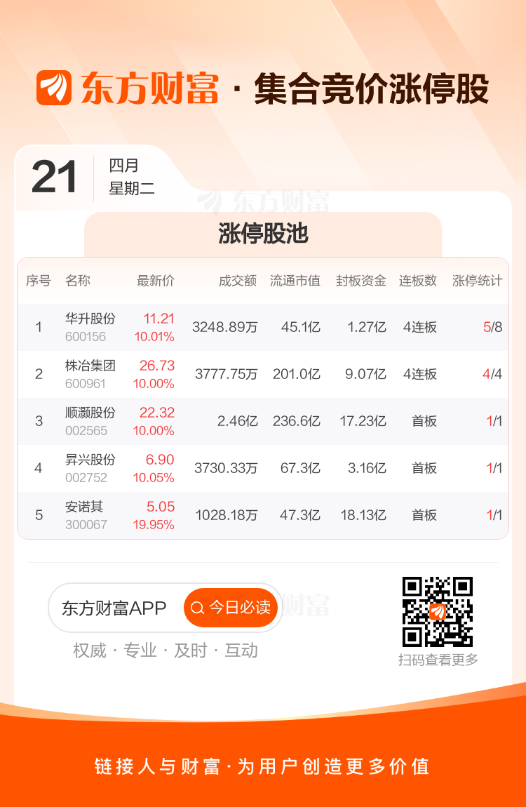 4月21日集合竞价:华升股份、株冶集团4连板