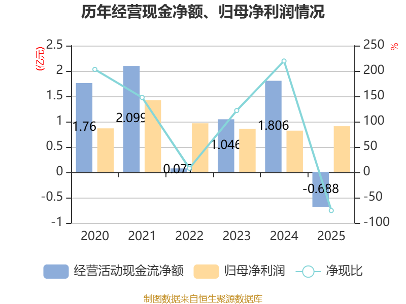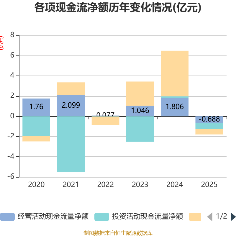 截至2025年,公司经营活动现金流净额为-6875.81万元,同比减少2.49亿元;筹资活动现金流净额-5367.46万元,同比减少5.05亿元;投资活动现金流净额-5668.74万元,上年同期为1731.56万元。