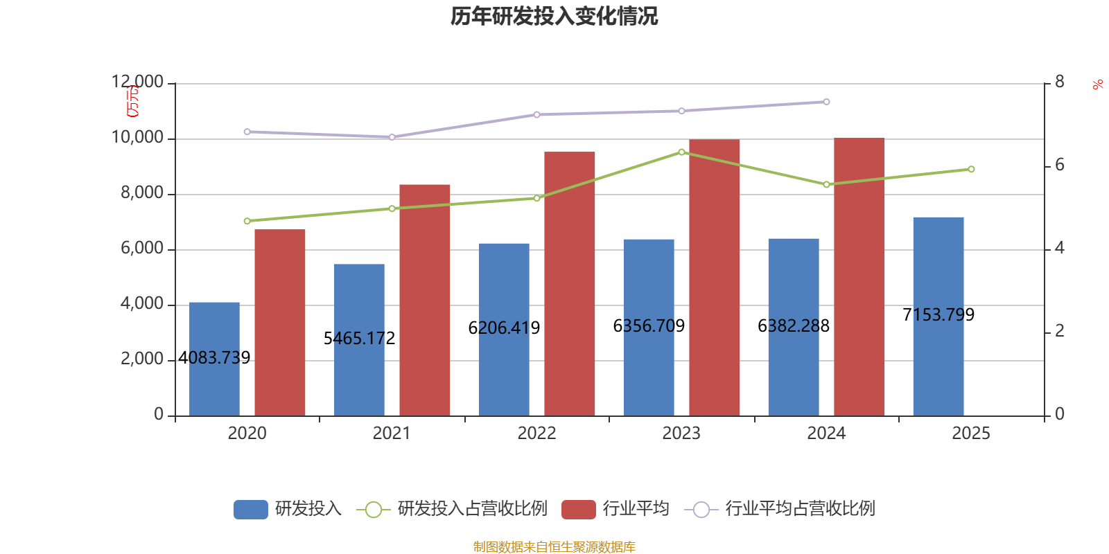 2025年全年,公司研发投入金额为7153.8万元,同比增长12.09%;研发投入占营业收入比例为5.93%,相比上年同期上升0.37个百分点。此外,公司全年研发投入资本化率为0%。