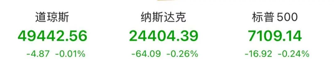 美东时间周一,美国三大股指小幅收跌,纳指终结13连涨的态势。随着美国与伊朗之间的停火协议临近到期,市场对谈判前景保持疑虑。截至收盘,道指跌0.01%,报49442.56点;纳指跌0.26%,报24404.39点;标普500指数跌0.24%,报7109.14点。