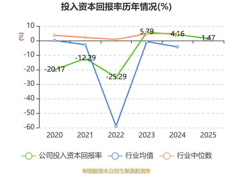 数据显示,2025年公司加权平均净资产收益率为0.92%,较上年同期下降3.23个百分点。公司2025年投入资本回报率为1.47%,较上年同期下降2.69个百分点。