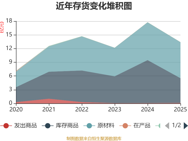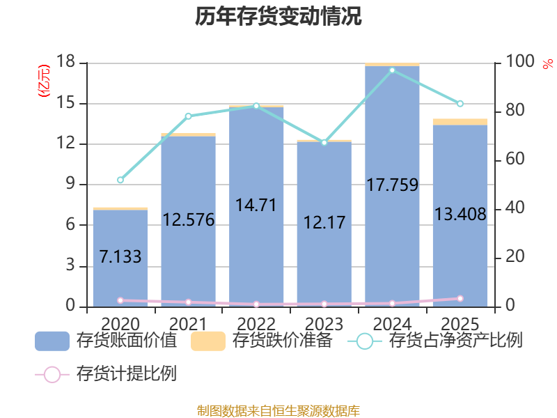从存货变动来看,截至2025年末,公司存货账面价值为13.41亿元,占净资产的83.21%,较上年末减少4.35亿元。其中,存货跌价准备为4566.11万元,计提比例为3.29%。
