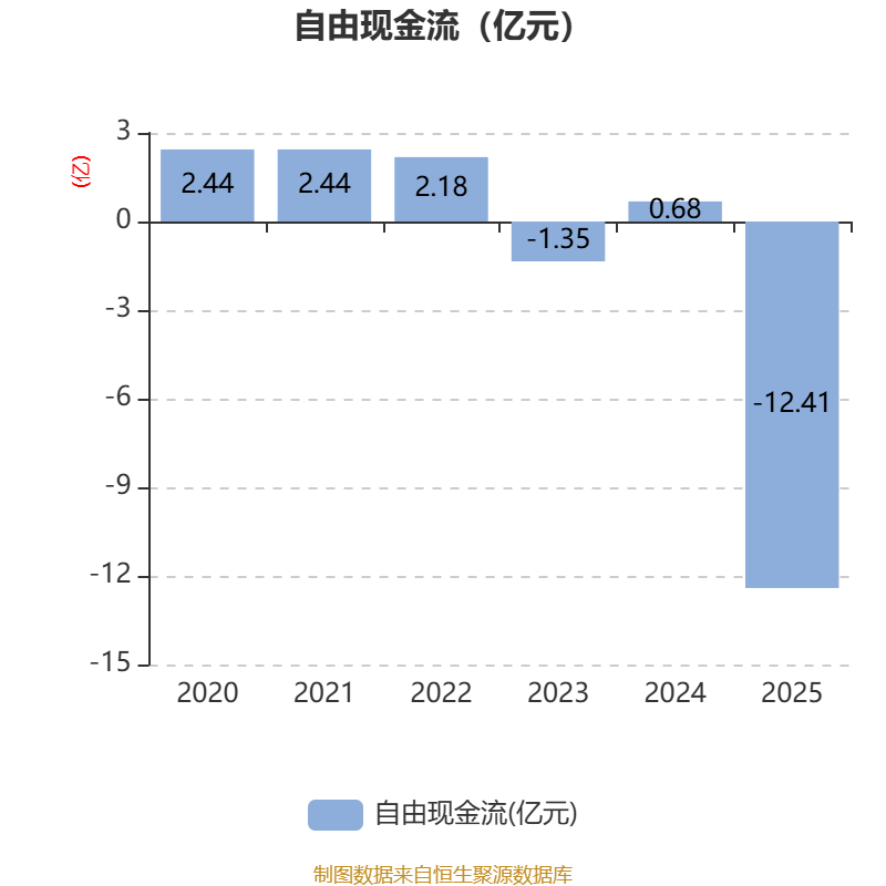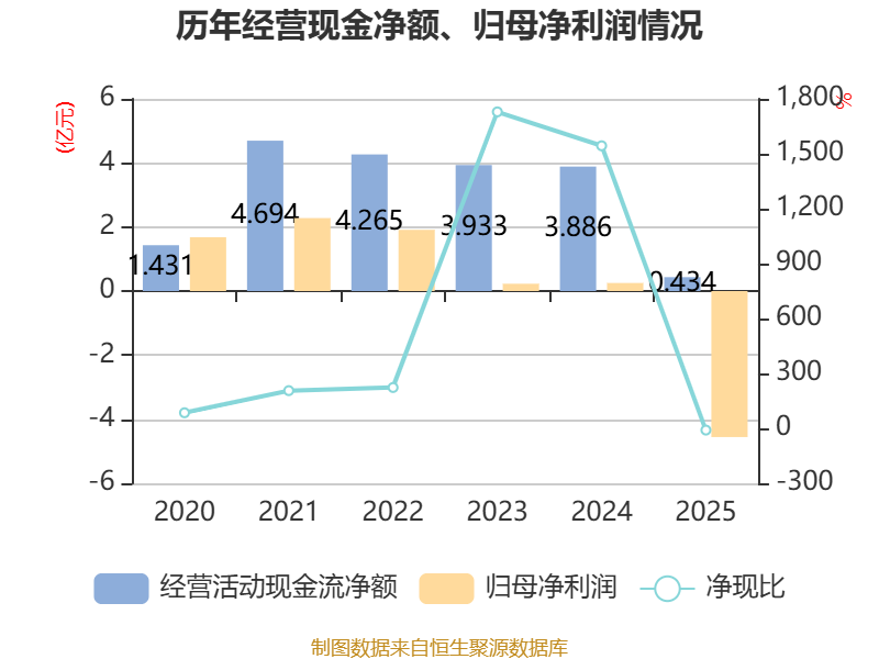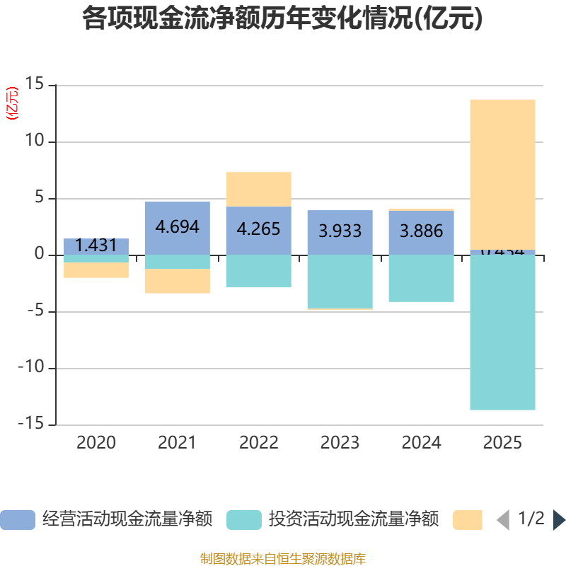截至2025年,公司经营活动现金流净额为4335.67万元,同比下降88.84%;筹资活动现金流净额13.27亿元,同比增加13.09亿元;投资活动现金流净额-13.73亿元,上年同期为-4.18亿元。