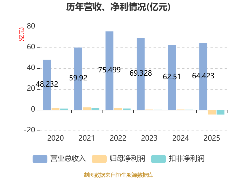 中证智能财讯六国化工(600470)4月21日披露2025年年度报告。2025年,公司实现营业总收入64.42亿元,同比增长3.06%;归母净利润亏损4.56亿元,上年同期盈利2517.54万元;扣非净利润亏损4.62亿元,上年同期盈利1220.98万元;经营活动产生的现金流量净额为4335.67万元,同比下降88.84%;报告期内,六国化工基本每股收益为-0.87元,加权平均净资产收益率为-25.60%。