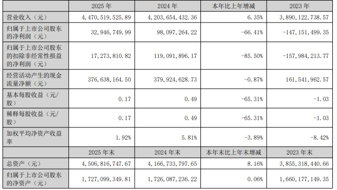 截至2025年,公司经营活动现金流净额为3.77亿元,同比下降0.87%;筹资活动现金流净额7027.02万元,同比减少8137.17万元;投资活动现金流净额-4.03亿元,上年同期为-4.88亿元。