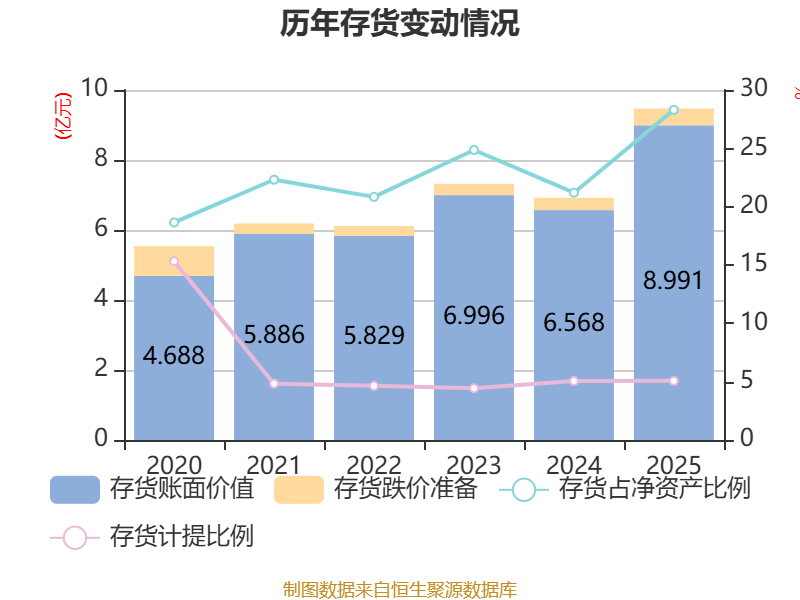 从存货变动来看,截至2025年末,公司存货账面价值为8.99亿元,占净资产的28.3%,较上年末增加2.42亿元。其中,存货跌价准备为4797.76万元,计提比例为5.07%。