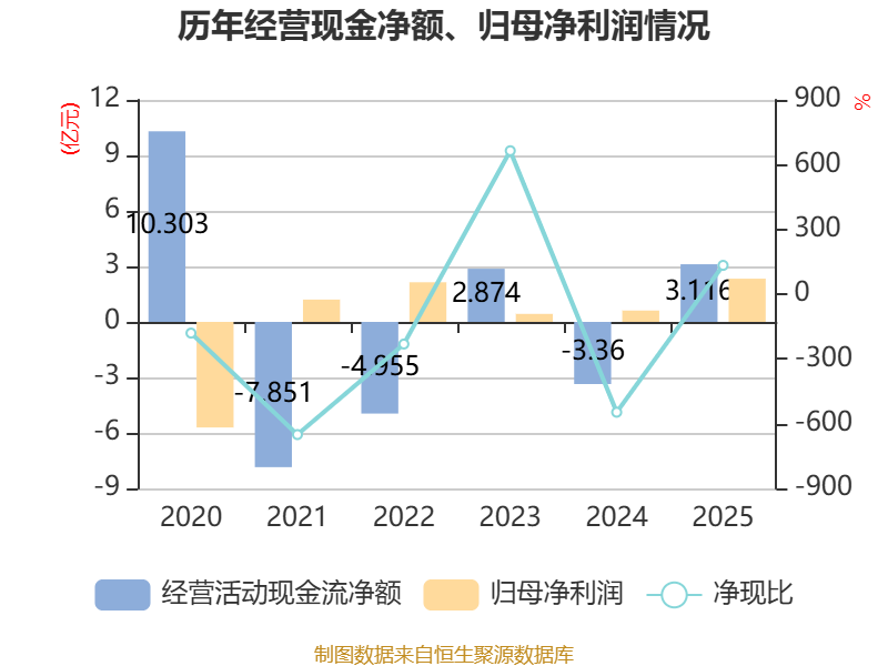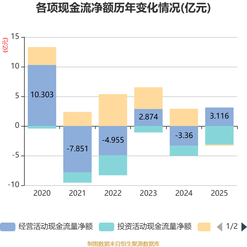 截至2025年,公司经营活动现金流净额为3.12亿元,同比增加6.48亿元;筹资活动现金流净额-1641.62万元,同比减少3.07亿元;投资活动现金流净额-3.16亿元,上年同期为-1.67亿元。