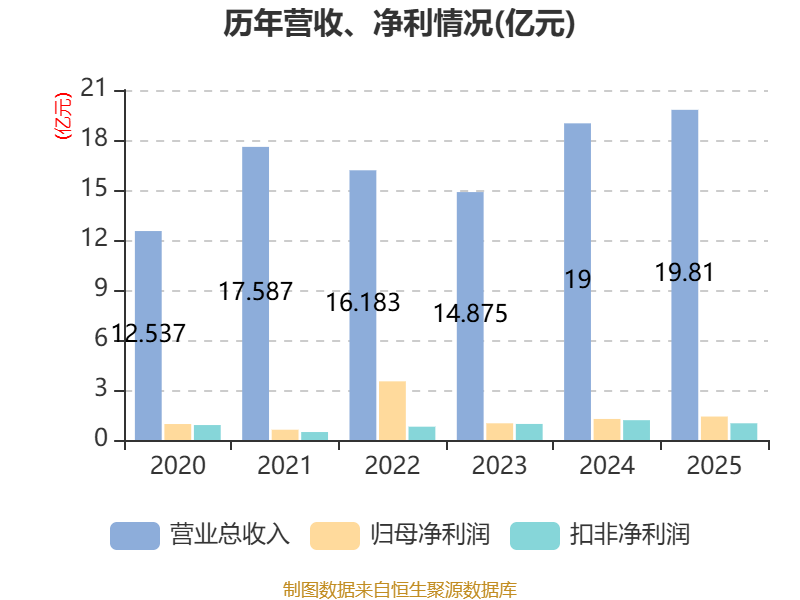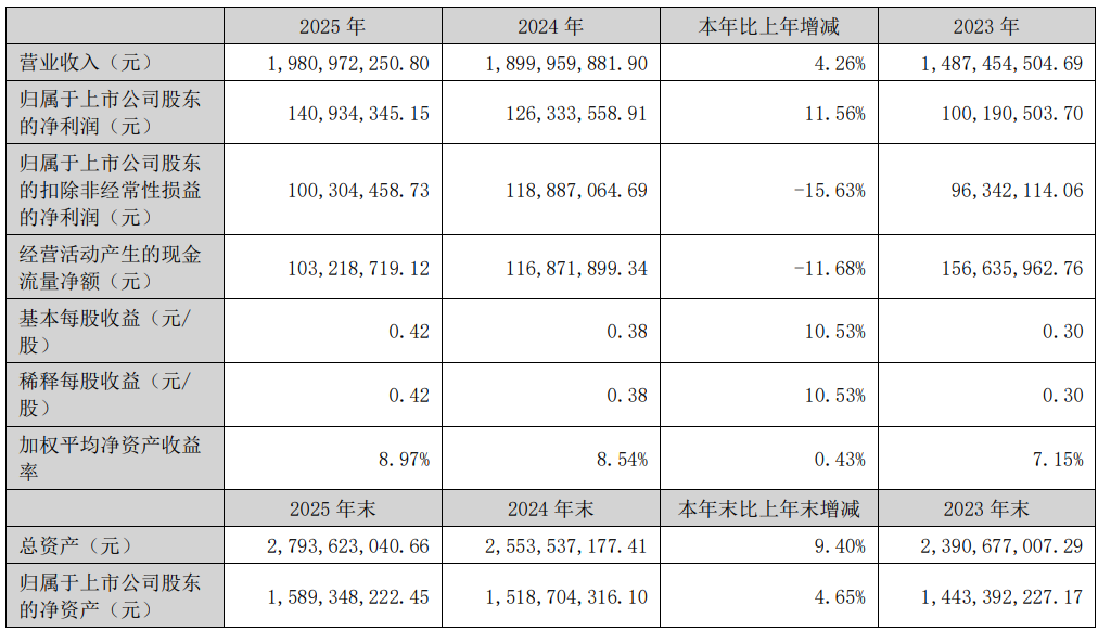 中证智能财讯纳尔股份(002825)4月21日披露2025年年度报告。2025年,公司实现营业总收入19.81亿元,同比增长4.26%;归母净利润1.41亿元,同比增长11.56%;扣非净利润1亿元,同比下降15.63%;经营活动产生的现金流量净额为1.03亿元,同比下降11.68%;报告期内,纳尔股份基本每股收益为0.42元,加权平均净资产收益率为8.97%。公司2025年度分配预案为:拟向全体股东每10股派现1.2元(含税)。