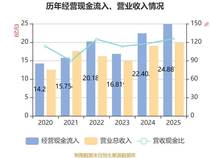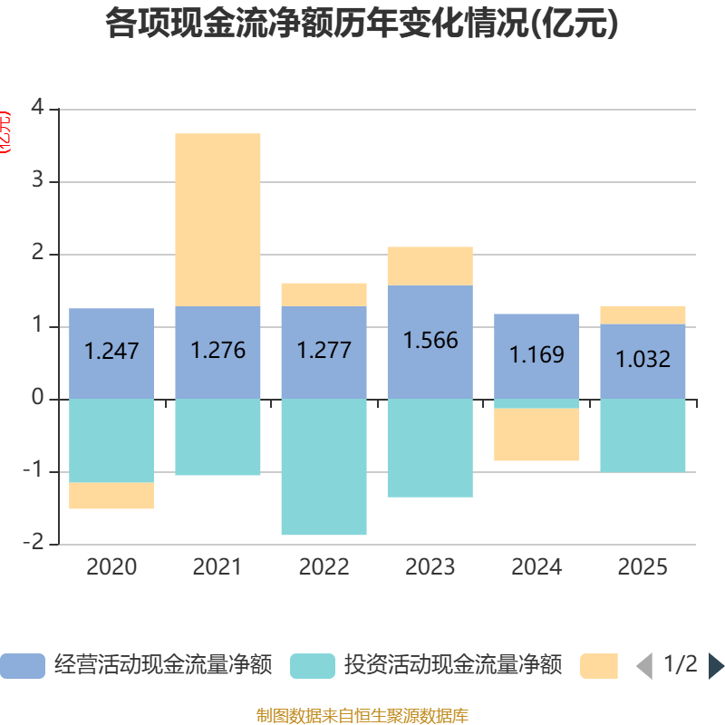 截至2025年,公司经营活动现金流净额为1.03亿元,同比下降11.68%;筹资活动现金流净额2437.29万元,同比增加9635.98万元;投资活动现金流净额-1.01亿元,上年同期为-1342.64万元。