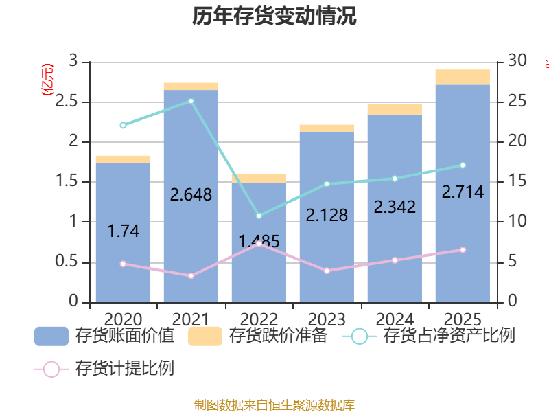 从存货变动来看,截至2025年末,公司存货账面价值为2.71亿元,占净资产的17.08%,较上年末增加3721.13万元。其中,存货跌价准备为1897.66万元,计提比例为6.53%。