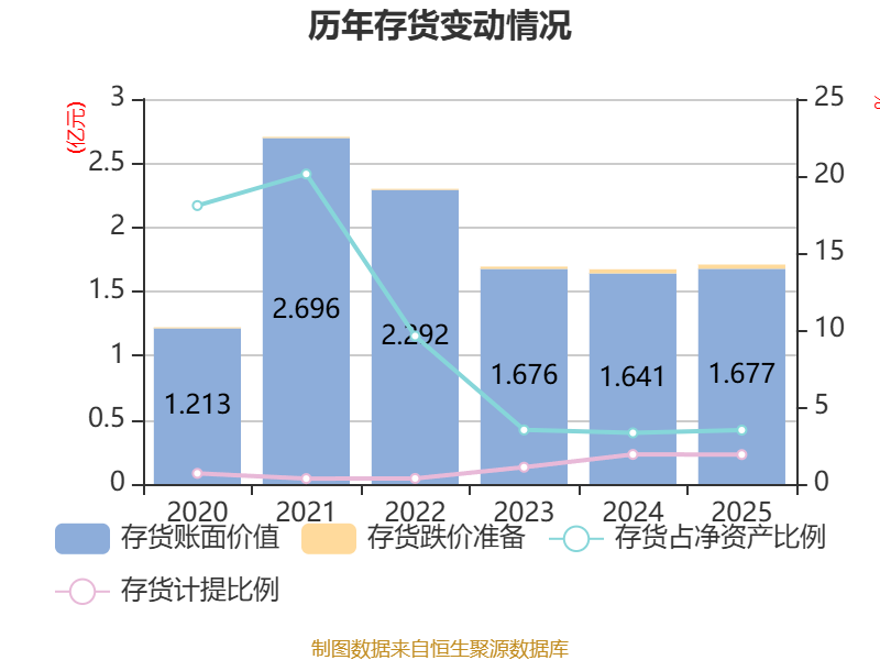 从存货变动来看,截至2025年末,公司存货账面价值为1.68亿元,占净资产的3.5%,较上年末增加360.66万元。其中,存货跌价准备为326.68万元,计提比例为1.91%。