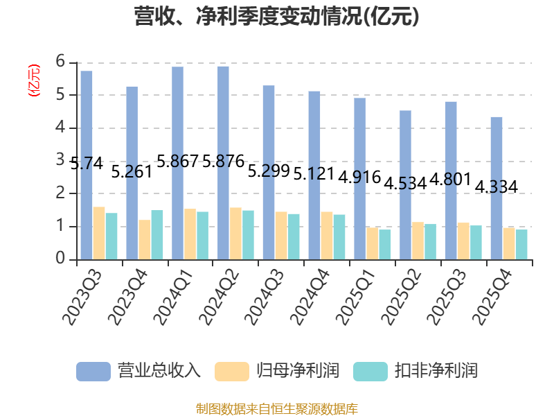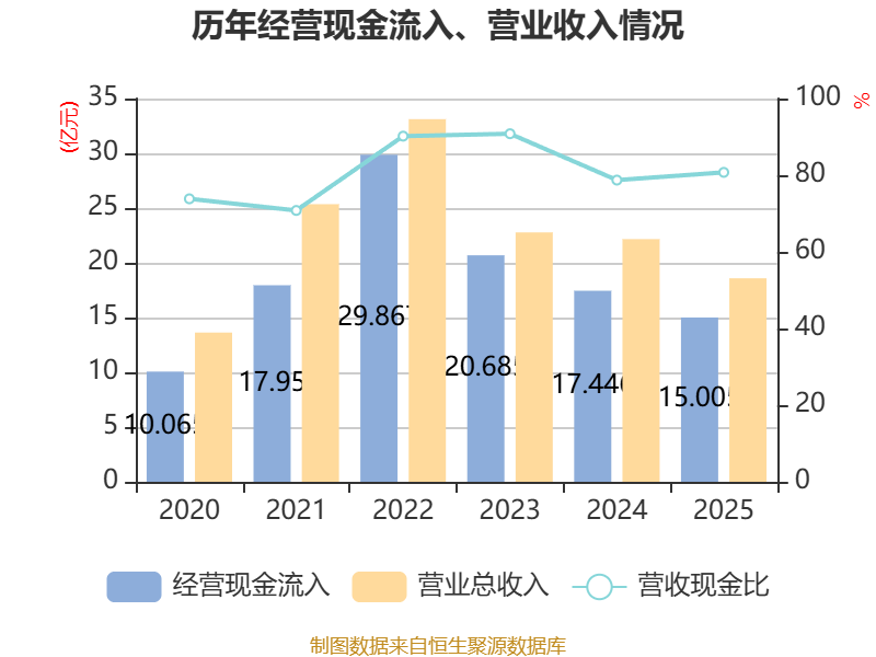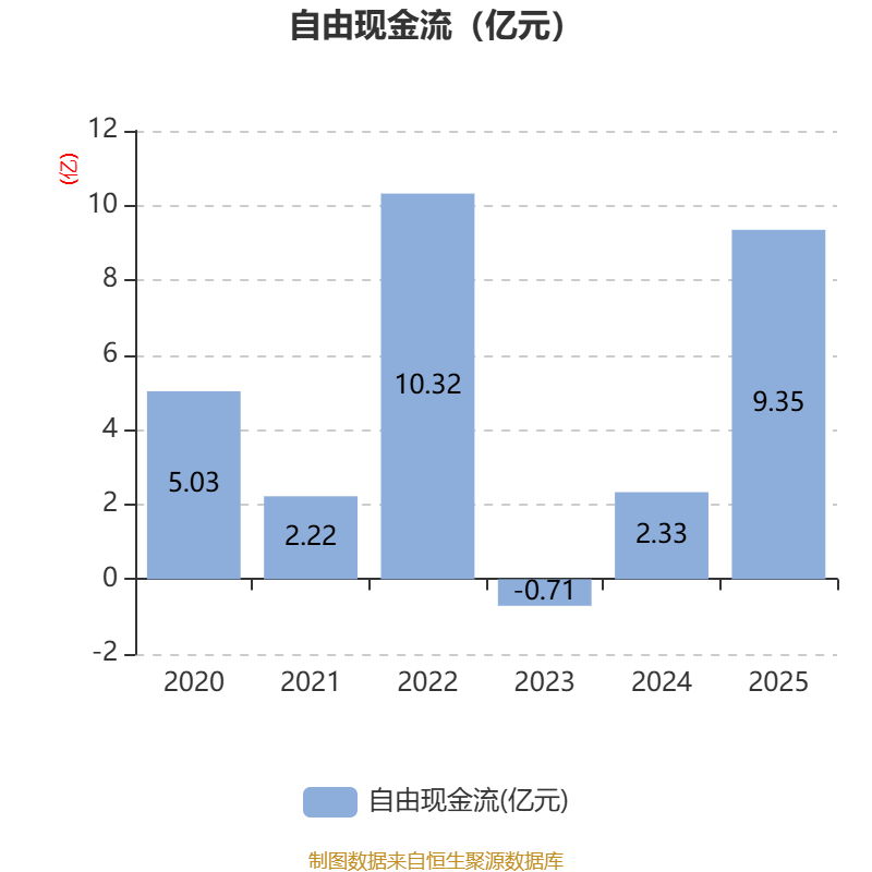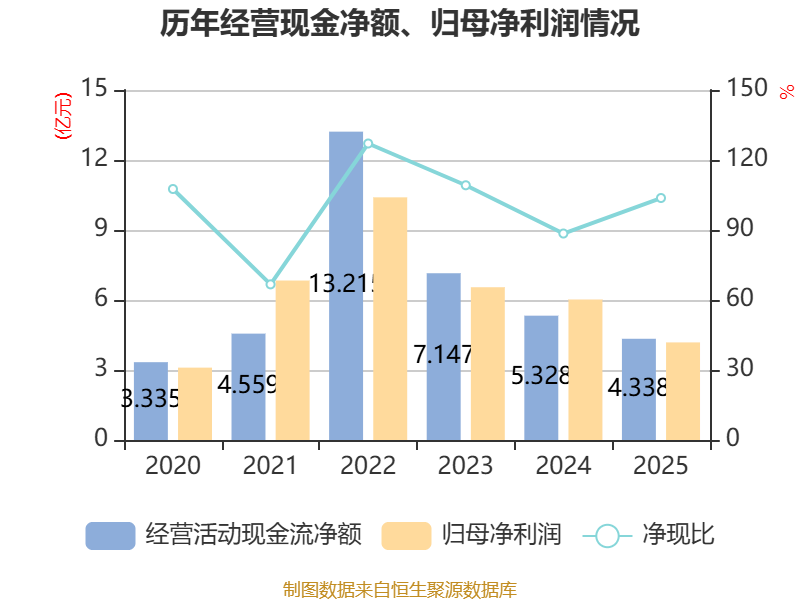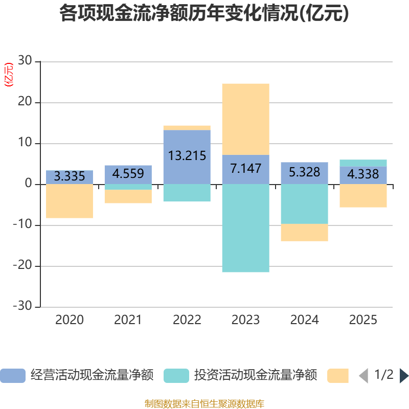 截至2025年,公司经营活动现金流净额为4.34亿元,同比下降18.59%;筹资活动现金流净额-5.7亿元,同比减少1.46亿元;投资活动现金流净额1.64亿元,上年同期为-9.74亿元。