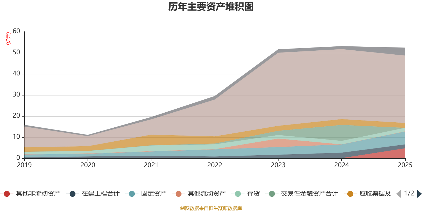 资产重大变化方面,截至2025年末,公司交易性金融资产合计较上年末减少100%,占公司总资产比重下降14.26个百分点;其他非流动资产较上年末增加5900.13%,占公司总资产比重上升8.83个百分点;固定资产较上年末增加57.01%,占公司总资产比重上升4.32个百分点;一年内到期的非流动资产占公司总资产的4.17%,上年末为0。