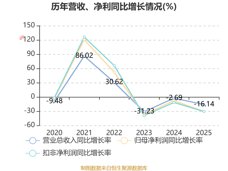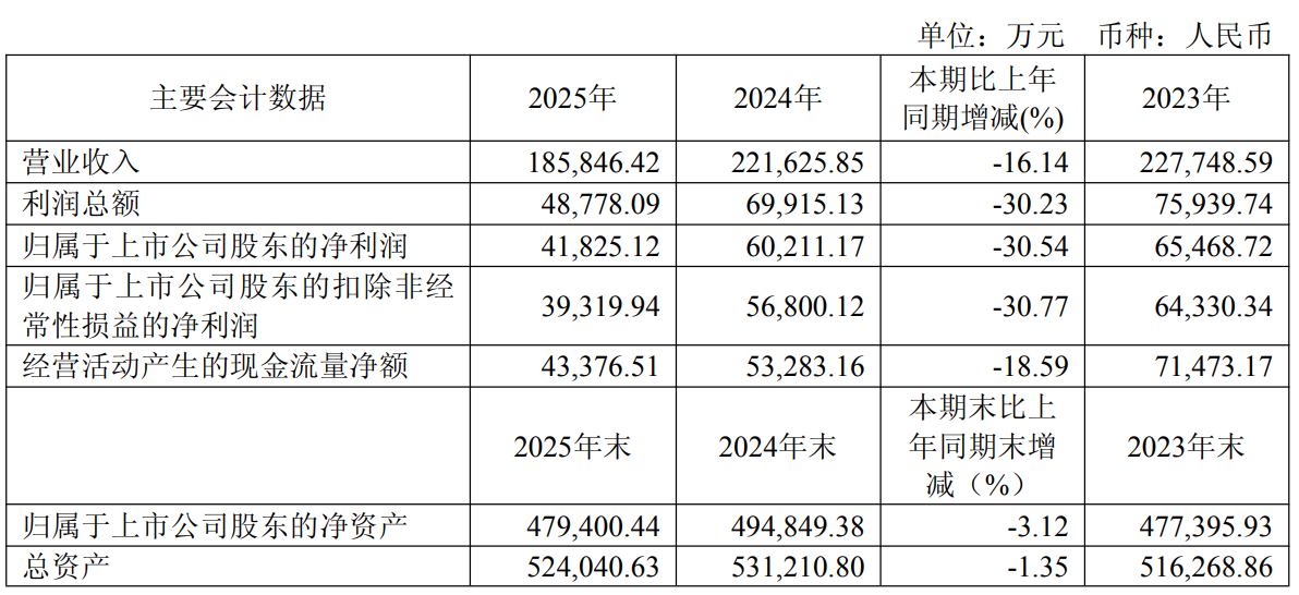 中证智能财讯江瀚新材(603281)4月21日披露2025年年度报告。2025年,公司实现营业总收入18.58亿元,同比下降16.14%;归母净利润4.18亿元,同比下降30.54%;扣非净利润3.93亿元,同比下降30.77%;经营活动产生的现金流量净额为4.34亿元,同比下降18.59%;报告期内,江瀚新材基本每股收益为1.14元,加权平均净资产收益率为8.50%。公司2025年度分配预案为:拟向全体股东每10股转4股,派现10元(含税)。
