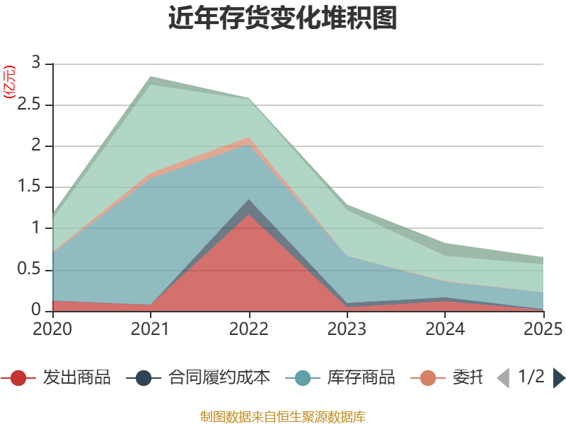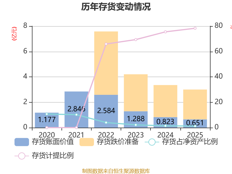 从存货变动来看,截至2025年末,公司存货账面价值为6509.67万元,占净资产的1.18%,较上年末减少1720.17万元。其中,存货跌价准备为2.35亿元,计提比例为78.31%。