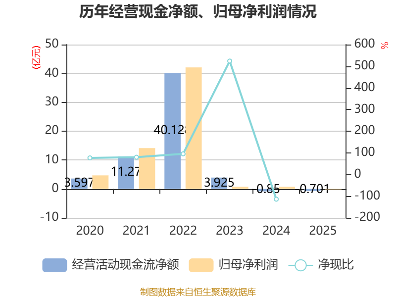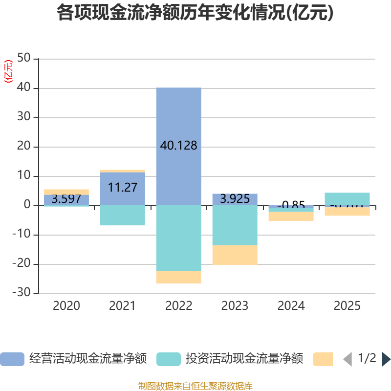 截至2025年,公司经营活动现金流净额为-7005.34万元,同比增加1499.31万元;筹资活动现金流净额-2.84亿元,同比增加2881.79万元;投资活动现金流净额4.3亿元,上年同期为-1.38亿元。
