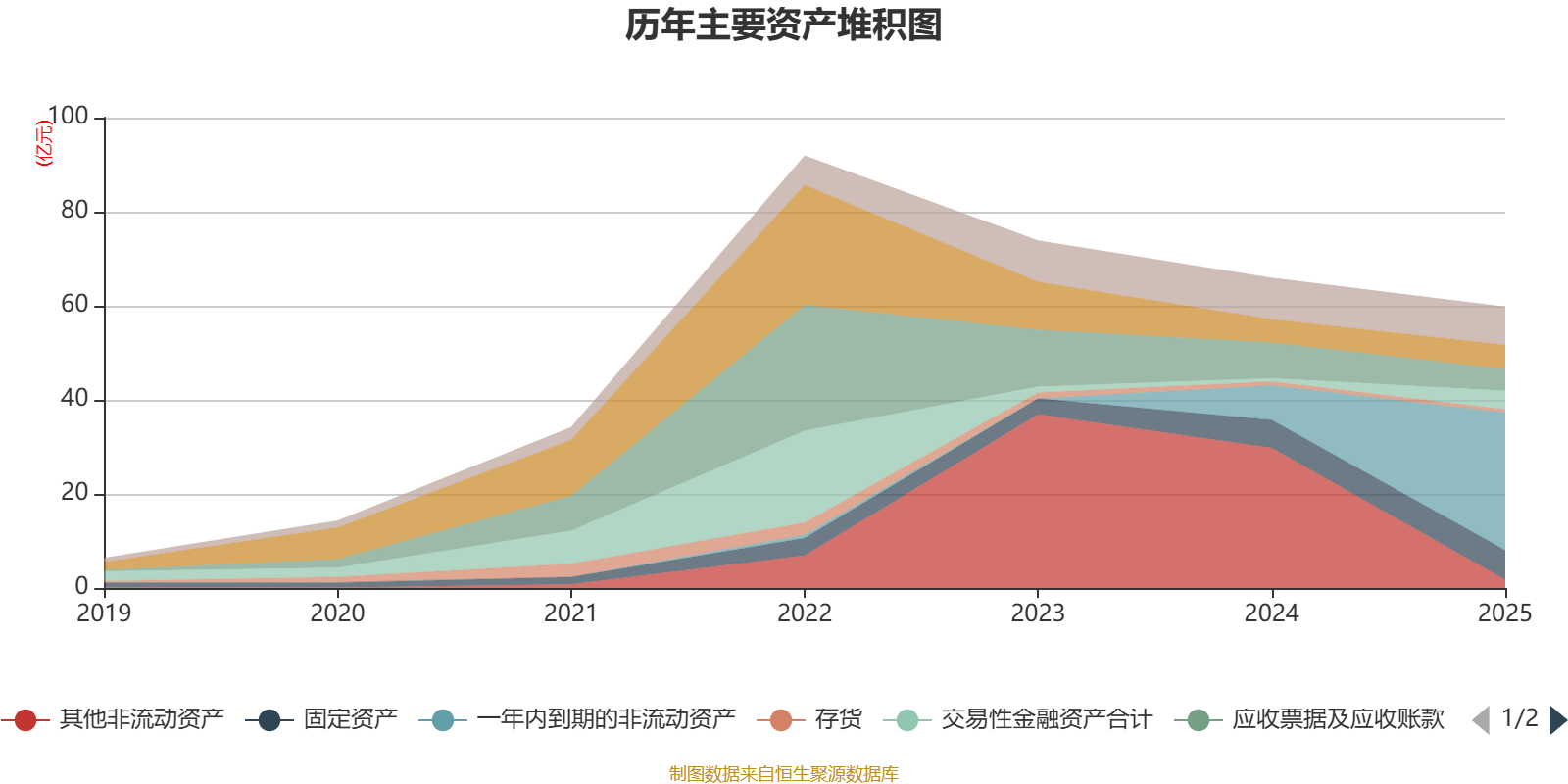 资产重大变化方面,截至2025年末,公司其他非流动资产较上年末减少94.06%,占公司总资产比重下降42.22个百分点;一年内到期的非流动资产较上年末增加296.32%,占公司总资产比重上升37.75个百分点;交易性金融资产合计较上年末增加515.07%,占公司总资产比重上升5.62个百分点;应收票据及应收账款较上年末减少39.01%,占公司总资产比重下降3.8个百分点。
